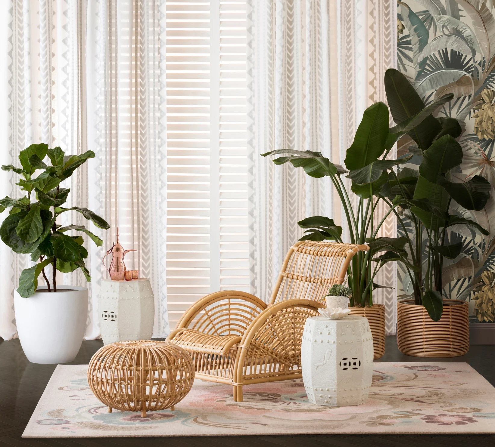 To protect your home from excess heat and light but maintain the aesthetic of a floaty linen Sheer, we suggest lining the Sheer Curtain with a plain voile, then installing Venetians, Shutters, or Roller Blinds as the blackout component. The Blind can nestle inside the window and almost disappear, but it has the functionality to control the light at day or night.